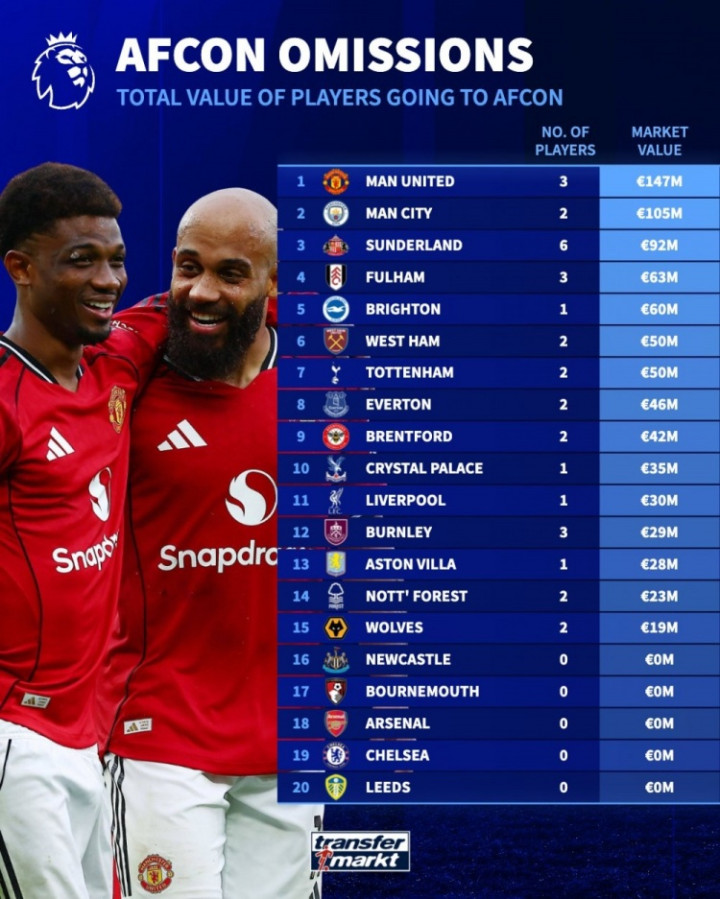 直播吧12月17日讯非洲杯即将战火重燃,《转会市场》也统计了因为要参加非洲杯而离队的英超各队身价损失榜,曼联居首。