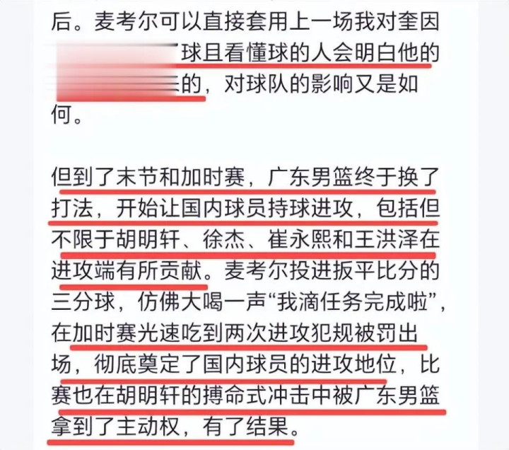 再看广东这边,从数据上看,轰下43分的外援麦考尔,似乎是这场逆转的最大英雄——他在第四节投中绝平三分,成功将比赛拖入加时,单场43分的得分也十分亮眼。但看过比赛的人都知道,事实并非如此,麦考尔不仅不是逆转英雄,反而被媒体人公开否定,他的43分,更像是“刷出来”的。