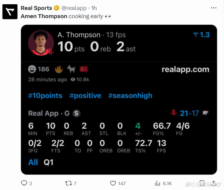 北京时间10月22日,NBA揭幕战,火箭1分惜败雷霆,双方鏖战双加时,但第二个加时赛阿门因为腿抽筋无法登场,这导致限制SGA变得非常困难,第二个加时赛SGA制造了4次犯规获得8个罚球,阿门整场跟着他跑消耗也的确太大。