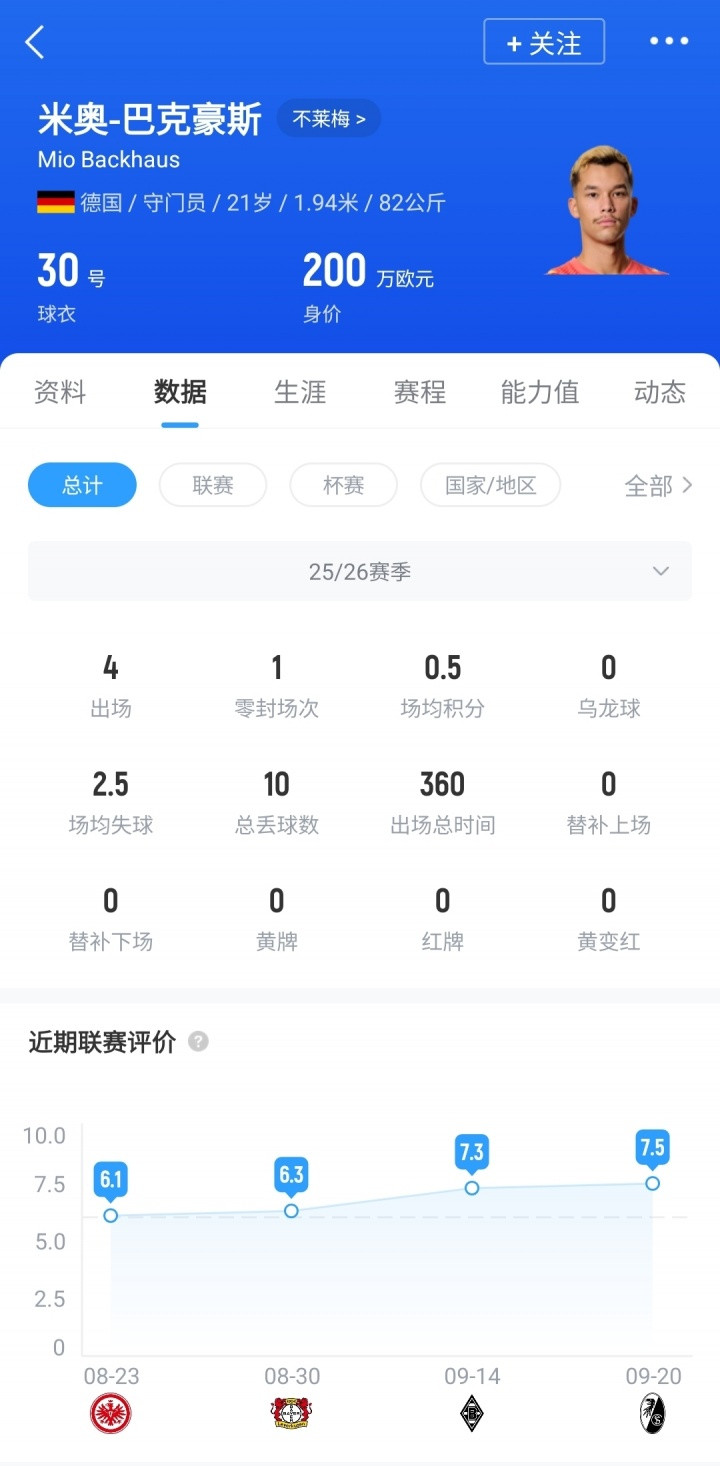 巴克豪斯,现年21岁,本赛季开始成为不莱梅主力门将,共出战4场比赛,丢掉10球,完成1次零封,目前德转身价200万欧。