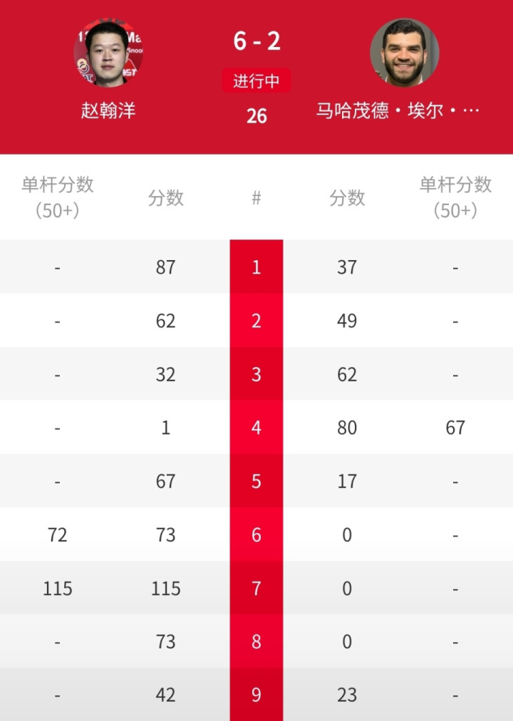 而8-1这样的比分,毫无疑问,已经让比赛失去悬念。如果说有悬念的话,那就是蓝裕豪能否以10-1横扫晋级,查蓬-纳萨是否能够多扳回几局。另外,中国选手赵瀚洋在与马哈茂德-埃尔-哈雷迪的第一阶段比赛中,以6-2领先对手。这两场比赛的第二阶段,将在明天凌晨2:00开始,期待他们的好消息!